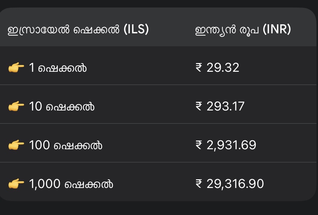 👉 വിനിമയ നിരക്ക്: നിലവിൽ 1 ഇസ്രായേൽ ഷെക്കൽ ഏകദേശം 29.32 ഇന്ത്യൻ രൂപയ്ക്ക് തുല്യമാണ്.
